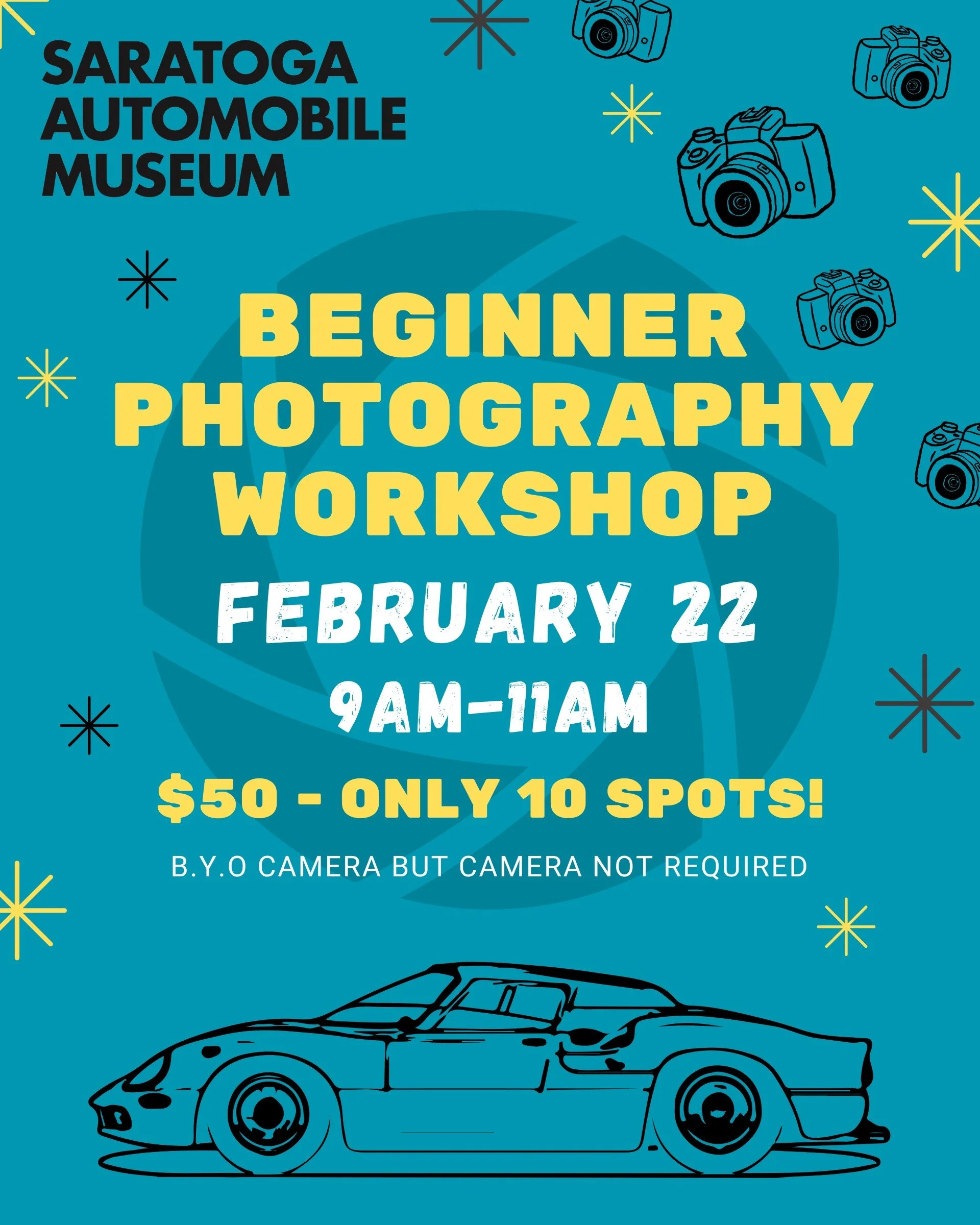 Join professional photographer, Zach Skowronek, as he teaches you the fundamentals of photography. From learning how your camera works, to properly exposing and framing your shots. The class will start with an engaging lecture on photography fundamentals, then, participants will be able to walk around the museum and apply what they've learned! Participants will leave the workshop with the necessary skills and knowledge to become a great photographer! Participants are encouraged to bring a camera; however, this is not required. The workshop will be held on February 22nd from 9AM-11AM at the Saratoga Automobile Museum. Workshop fee is $50.
